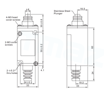 • 内部结构:内藏微动开关有双簧片设计结构,机械寿命长